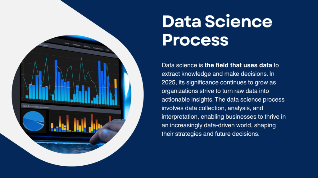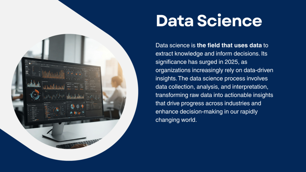 It’s the practice of extracting insights from raw data using statistics, programming, AI, and machine learning. You collect data, clean it, analyze it, build models, and use the results to make smarter decisions.